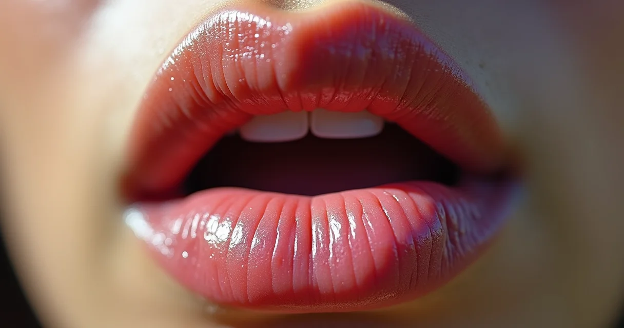 Close-up de lábios vermelhos levemente entreabertos, com foco na textura da pele e um leve brilho labial, evocando a ideia de ‘beijo de arco íris’ de forma sutil.