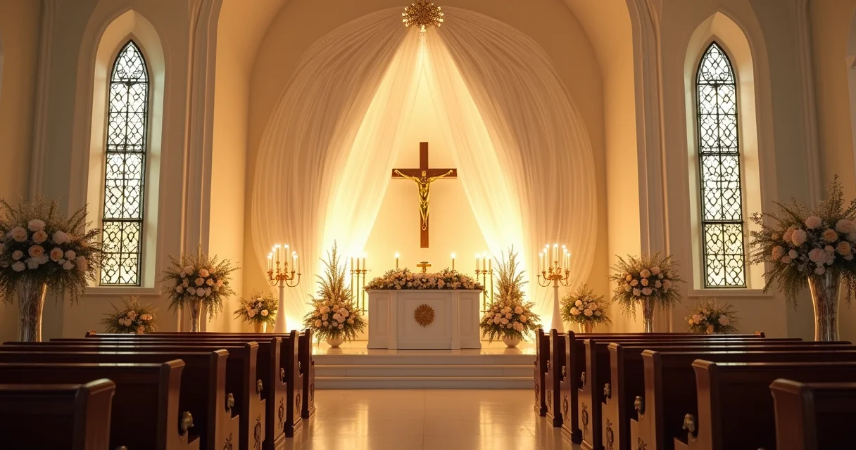 Tecidos que Flutuam: Suavidade e Elegância. O tule e o voil branco são nossos aliados para trazer leveza. Eles suavizam o ambiente, criando um véu de paz sobre o altar e as naves. É como um abraço visual para os fiéis.
