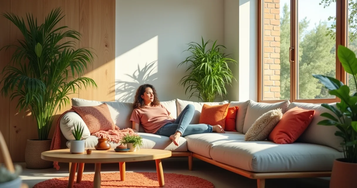 Texturas que Abraçam: Mantas de tricô fofinhas jogadas no sofá, almofadas macias em diferentes texturas (linho, veludo, algodão) e um tapete felpudo ou de fibras naturais. A ideia é convidar ao toque.