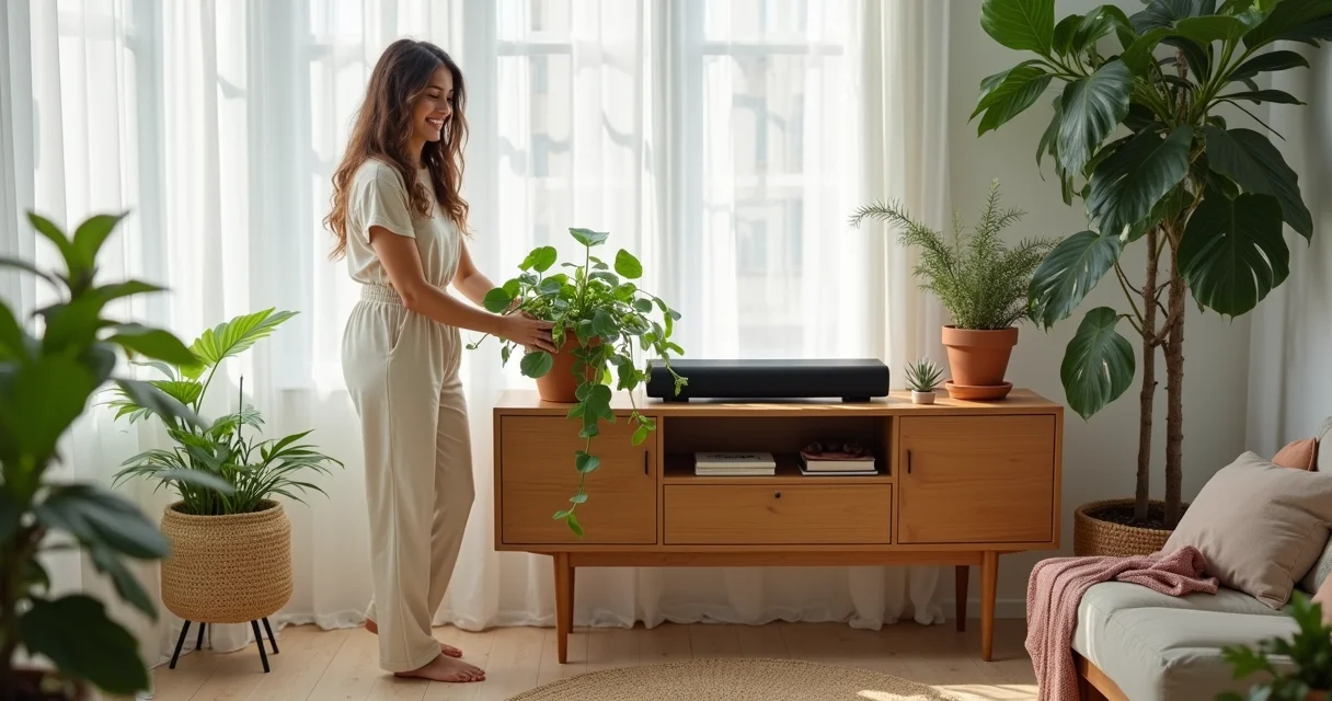 O pulo do gato é: evite plantas muito grandes que possam bloquear a tela ou as caixas de som. Plantas pendentes nas laterais do rack ou suculentas e cactos no tampo são perfeitas. Se o ambiente for mais escuro por causa da TV, opte por espécies que toleram pouca luz, como a Zamioculca. A ideia é criar um ambiente acolhedor e relaxante para suas sessões de filmes e séries, com um toque de natureza que só as plantas podem dar.