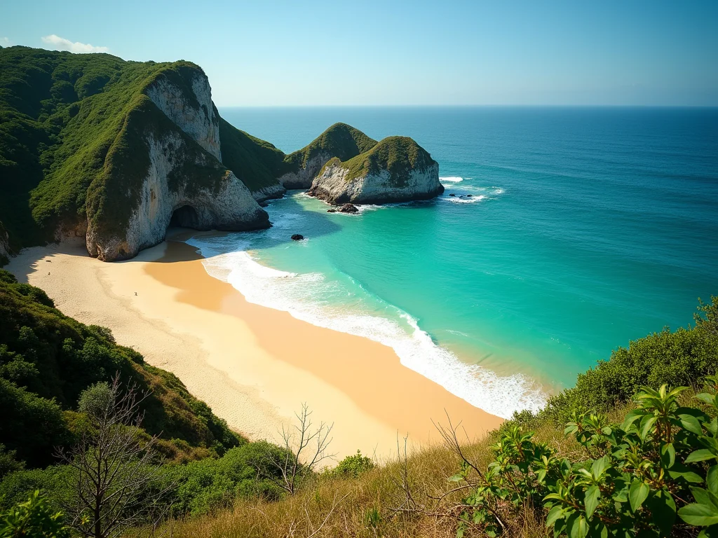 Praia com atmosfera rústica, areia clara, mar azul com ondas suaves, e trilhas sinuosas visíveis nas encostas verdes.