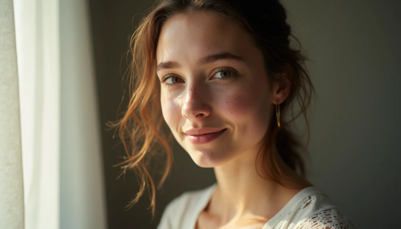 Rosto de uma pessoa com sardas e um leve bronzeado, em um ambiente com luz quente e difusa.