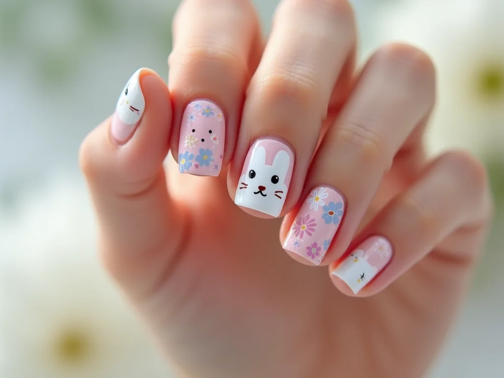 Mão com unhas decoradas com coelhinho páscoa, onde cada unha exibe um detalhe diferente: orelhas, focinho e rabinho em relevo sutil.